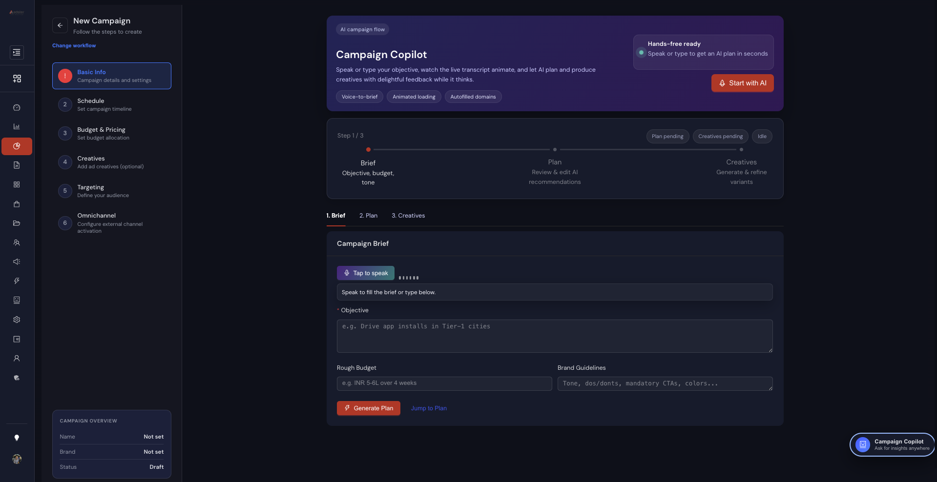 Launch campaigns in minutes with our AI Campaign Copilot. Speak or type your objective and let AI generate the brief, plan, and creatives — all within a guided, white-labeled workflow